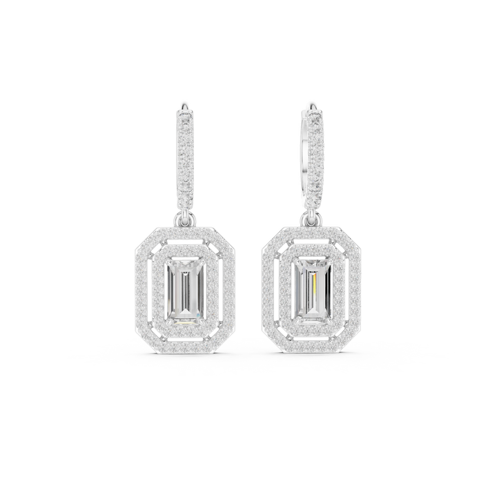 Custom Made 1.35ct Baguette-Cut Diamond Halo Drop Earrings in 18K White Gold Lab Grown Diamond for Engagement or Gift