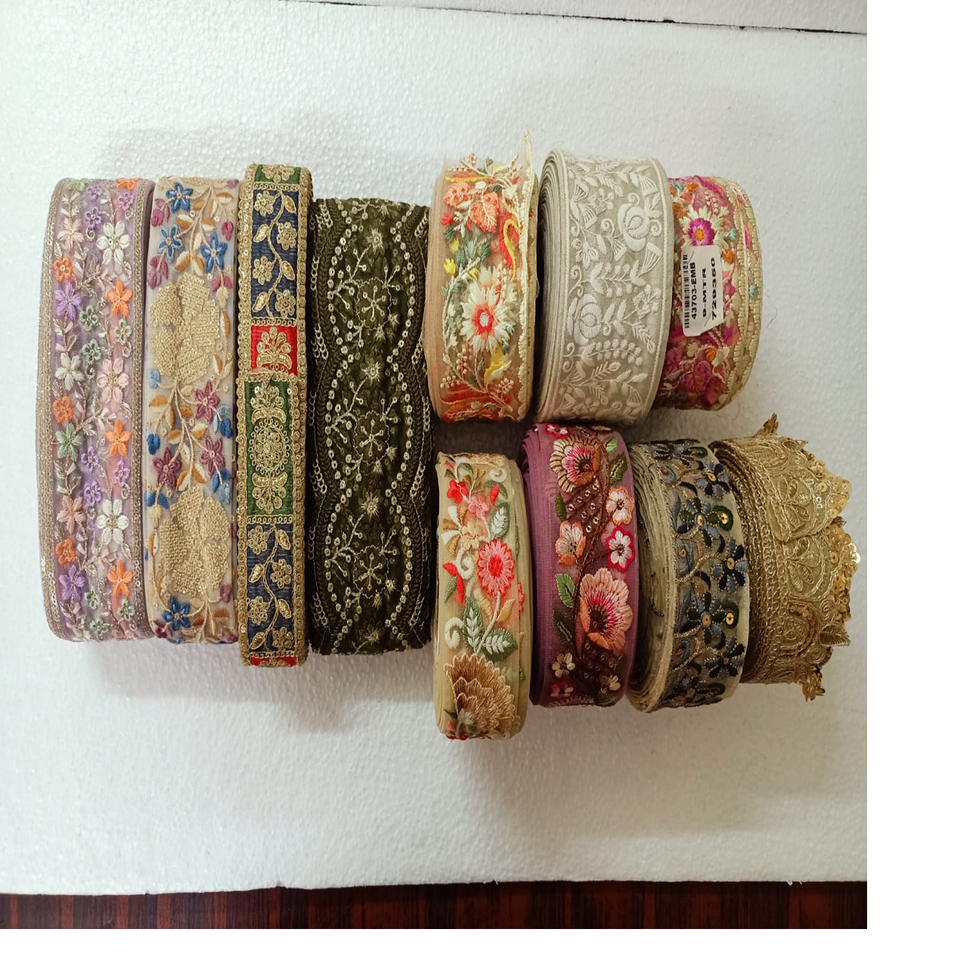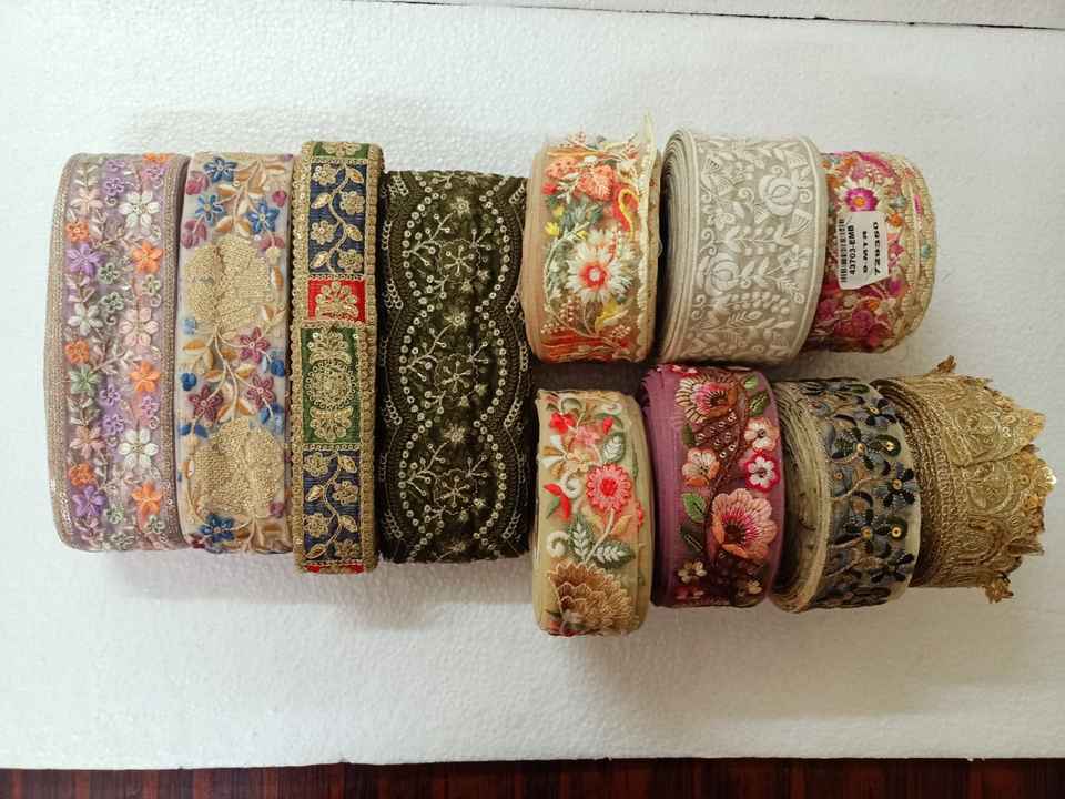 Custom Made Embroidered Thread Work Laces with Multi Coloured Options in Stones Fixed in 1 Inch Width on Net Fabric.