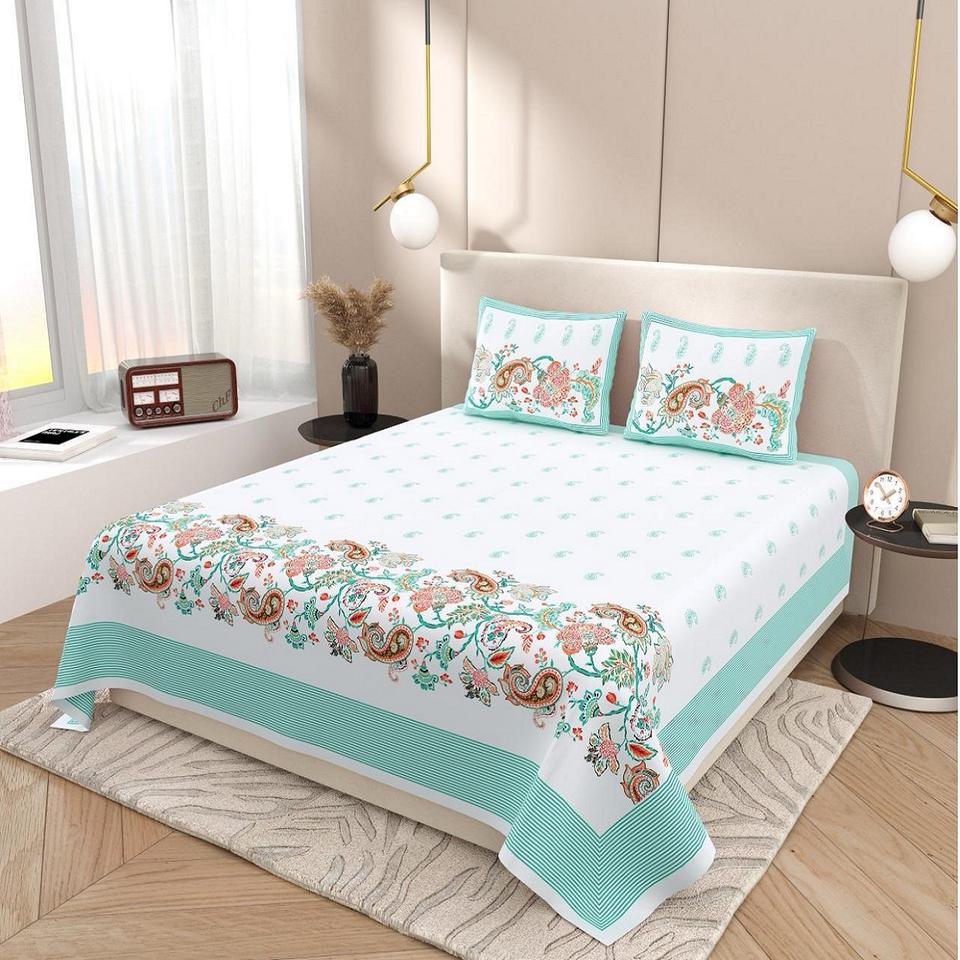 Custom Made Exquisite Cotton Hand Block Printed Bed Sheet in With Border in Turquoise Blue Color Idle for Home Decor and Gifting