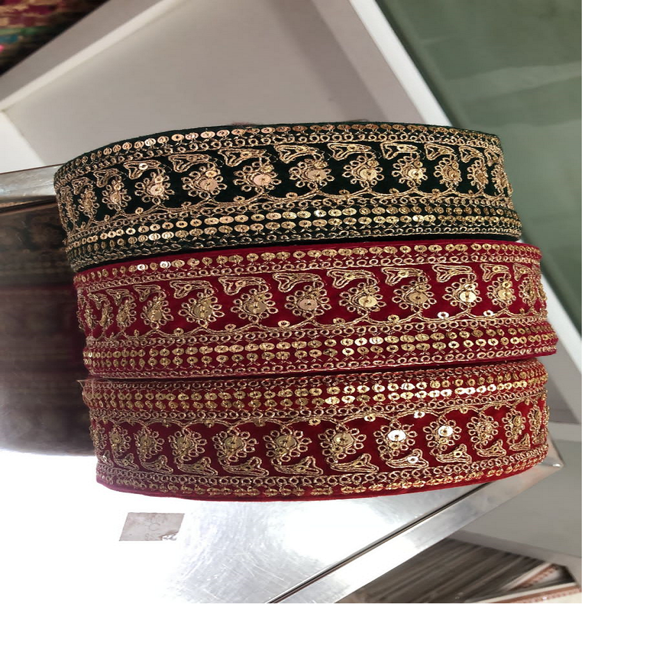 Custom Made Floral Design Machine Embroidered with Sequins Embroidery Black & Maroon Coloured Ribbon & Laces for Wedding Dresses
