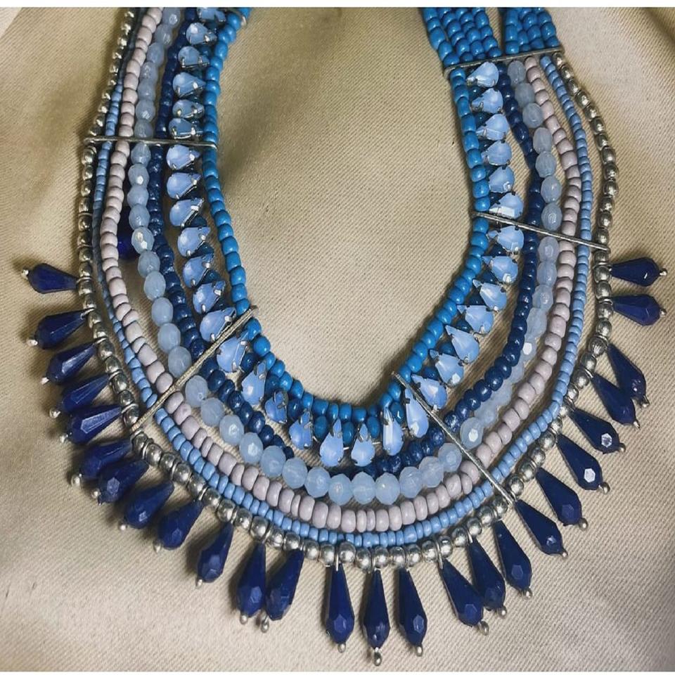 Custom Made Glass Beaded Layered Necklaces Made with Glass, Bone and Metal Beads Ideal for Fashion Jewelry Stores in Blue Beads