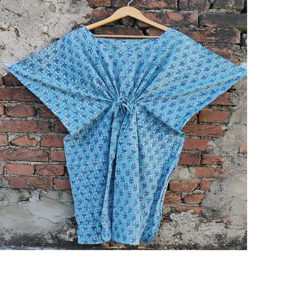 Custom Made Kaftans Printed Cotton Chiffon with Lovely Floral Design Ocean Blue Base Fabric Natural Waistline
