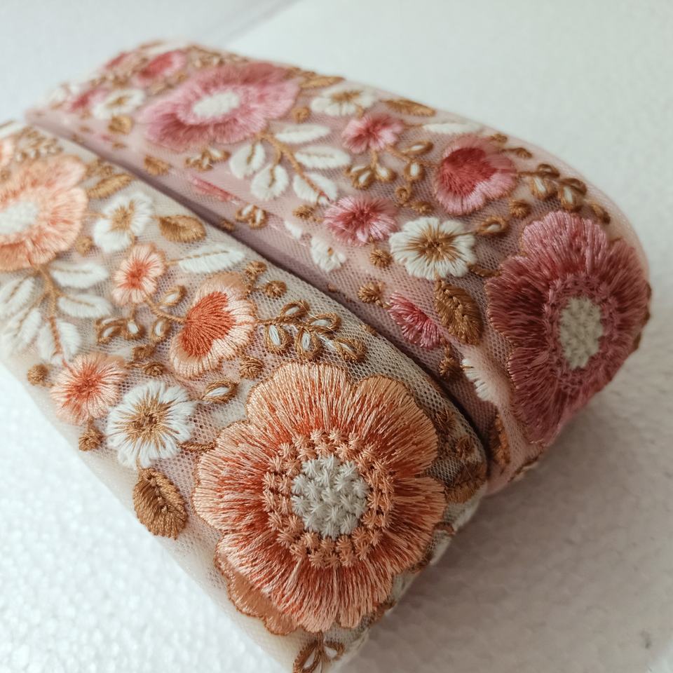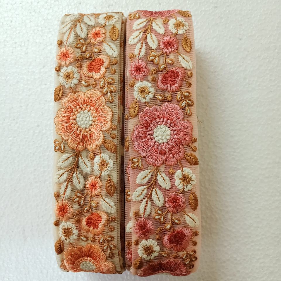 Custom Made Machine Embroidered Ribbons & Laces in Flower Designs & in Two Colours for Wedding Dresses on Net Fabric.