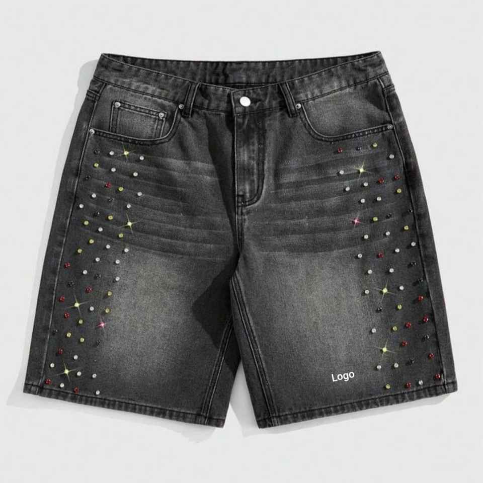 Custom Made Men Casual Straight Denim Shorts Vintage Style Zipper Raw Hem Cotton Fabric Breathable Quick Dry Summer Rhinestones