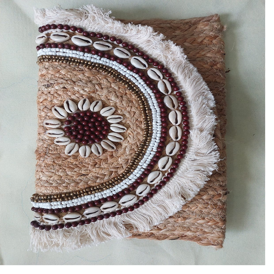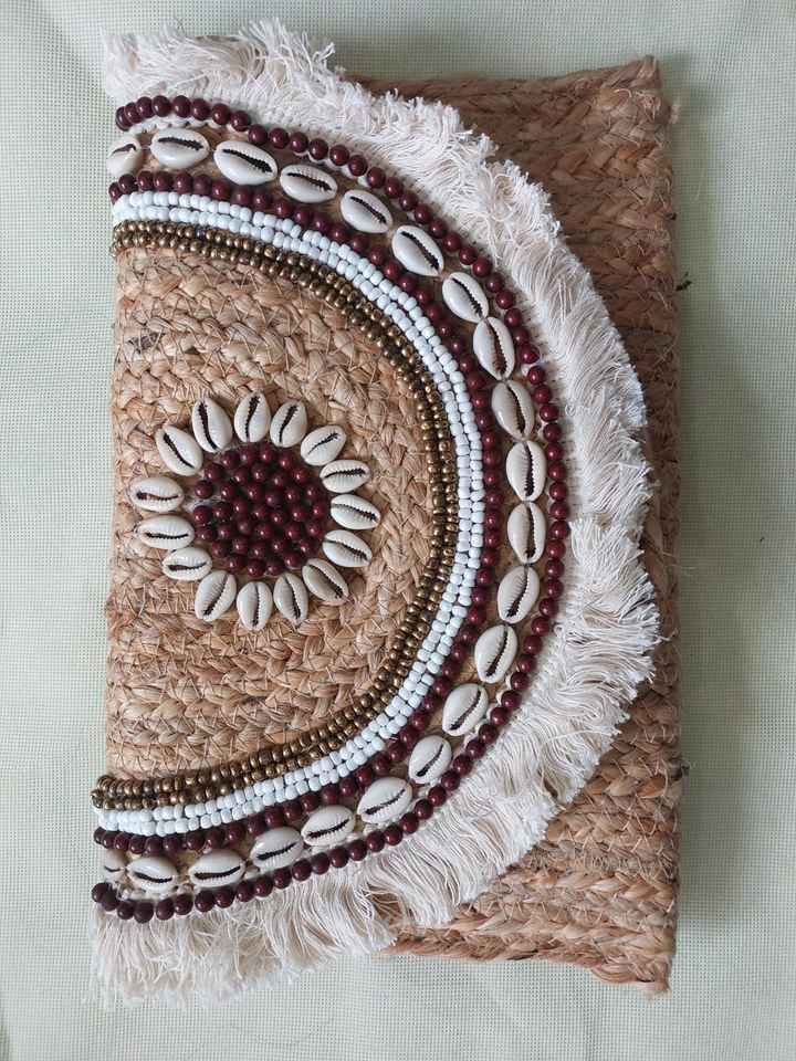 Custom Made Multi Coloured Hand Jute Purses with Shell Trims and Cotton Fringe Trim for Fashion Accessory Stores and Bag Stores