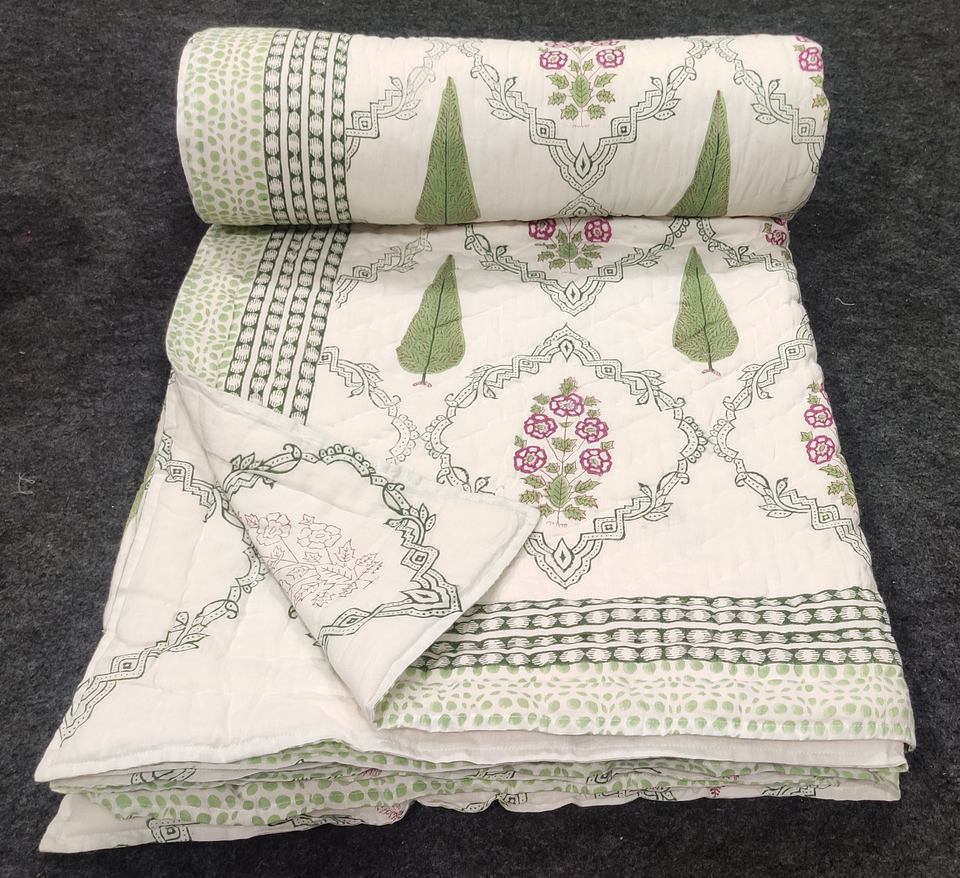 Custom Made Organic Eco-Friendly Handmade 100% Cotton Bed Quilt with Printed Kantha Design for Resale & Home Use