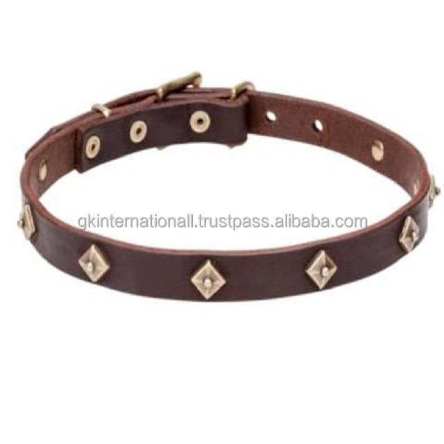 Custom Made Plain Brown Leather Dog Collar Decorated with 1 Row Brass Studs and Adjustable Roller Buckle D Ring Bulk Order