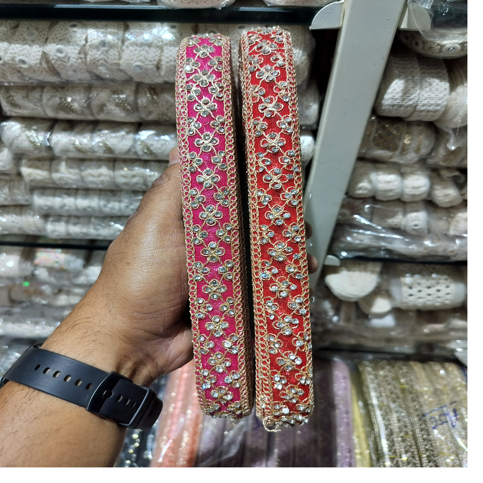 Custom-Made Red Rani Organza Wedding Dresses for Brides with Stones Fixed Machine Embroidered Ribbons and Laces