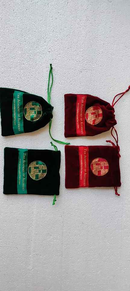 Custom Made Velvet Bags With Gold Print in Size 4.5 Inch X 5.5 Inch in Green & Burgundy Shades in Drawstring Pattern.