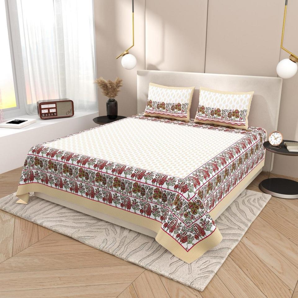 Custom Made Vibrant Cotton Bed Sheet in Floral Design in Red Turquoise and Green on a Soft Leafy Green. Idle for Home Decor