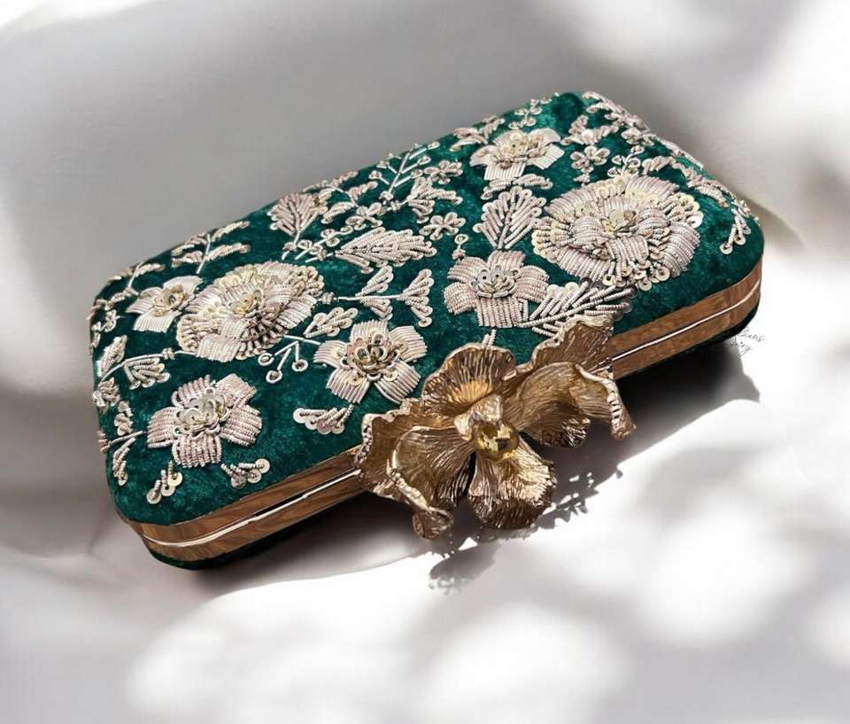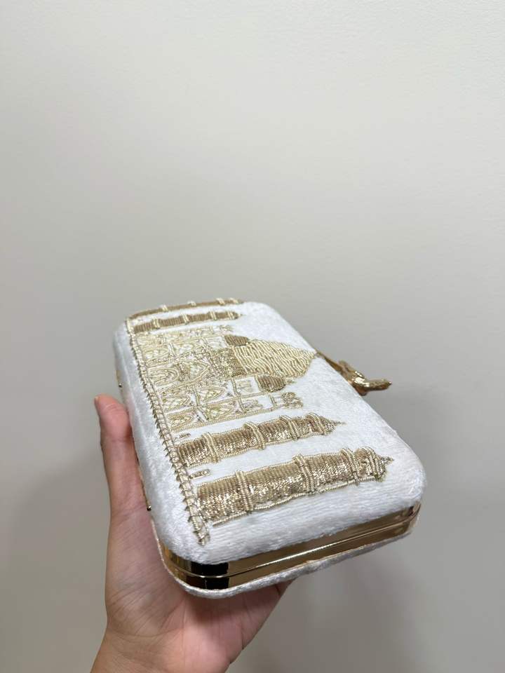 Custom Made White Coloured Metal Monument Designed Hand Embroidered Evening Purses Clutches for Fashion Designers Resale