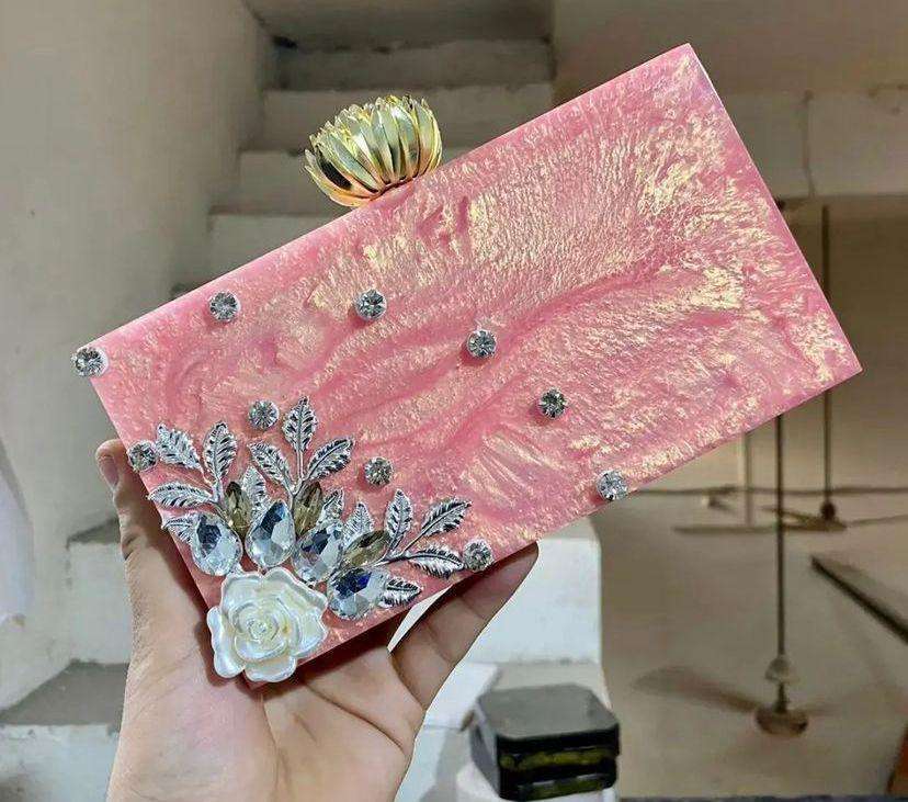 Custom Made White Coloured Resin Purses with Multi Coloured Embellishments Ideal for Fashion Accessory Stores for Resale