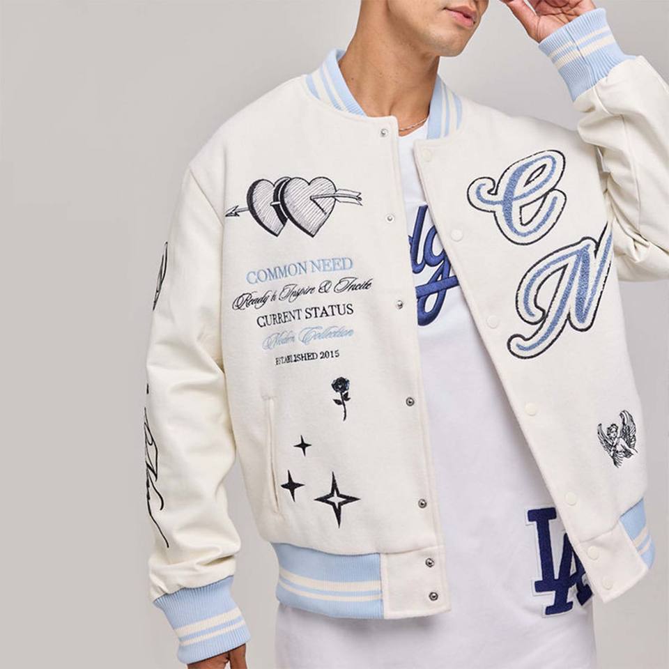 Custom Man's Baseball Jacket Rib Trim Pattern New Design Varsity Jacket Leather Sleeve Pocket Letterman Style Hooded Canvas