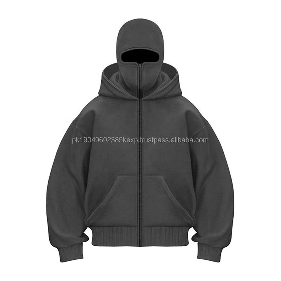 Custom Manufacturer Oversized Ninja Balaclava Hoodie for Men Double-Layer Heavy Fleece with Embroidered Full Zip up Cotton Mask