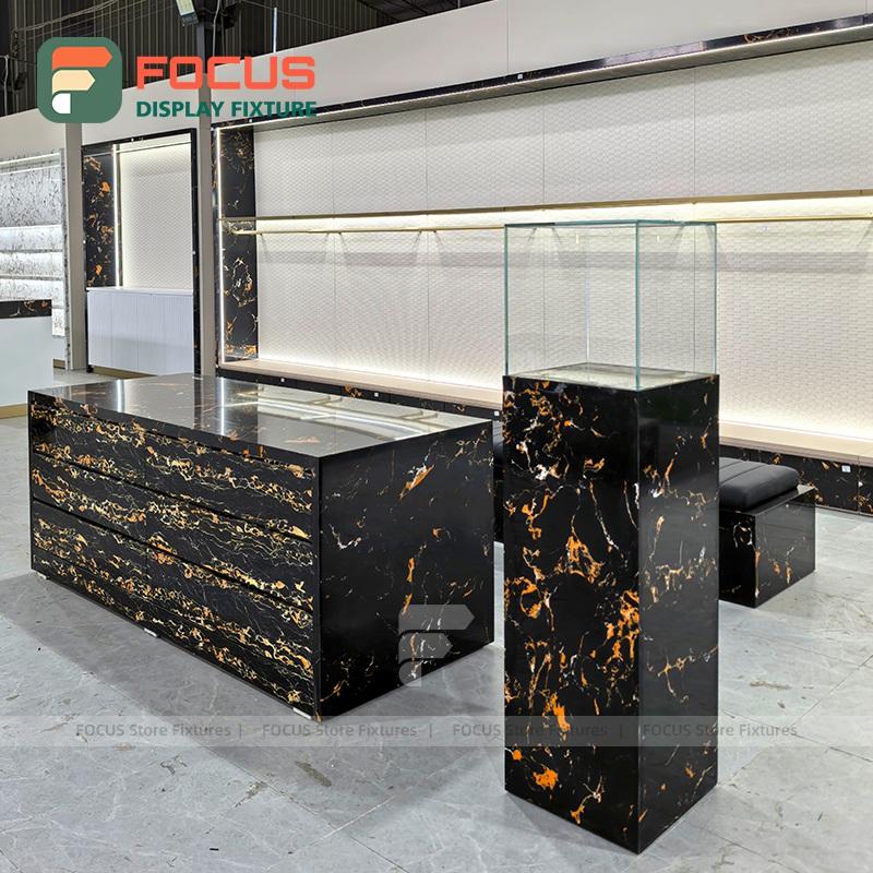 Custom Marble Texture Display Cabinet Glass Showcase Counter Luxury Jewelry Boutique Retail Store Fixture Design