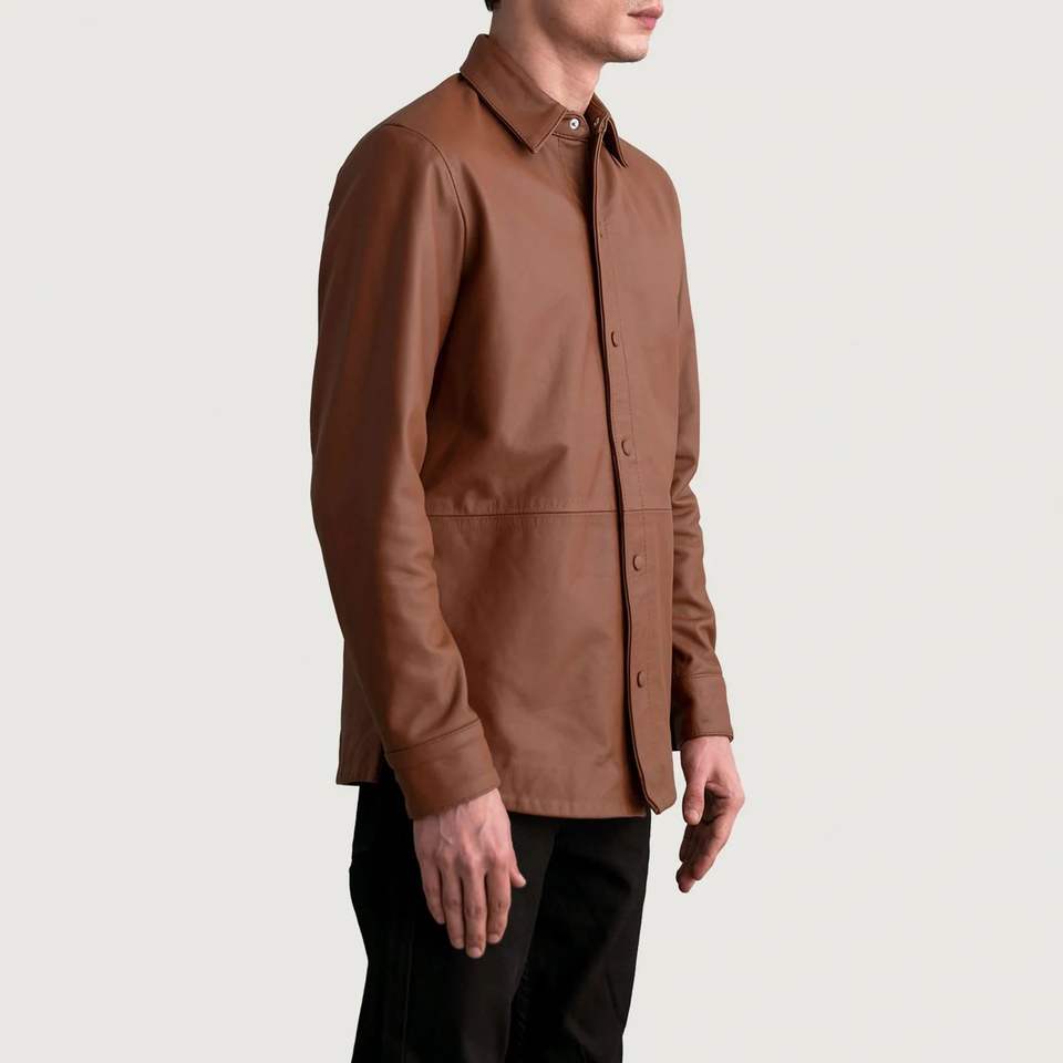 Custom OEM Men's Jackets Matte Brown Leather with Stand Collar Casual Winter Style Front Logo Closure and Leather Buttons