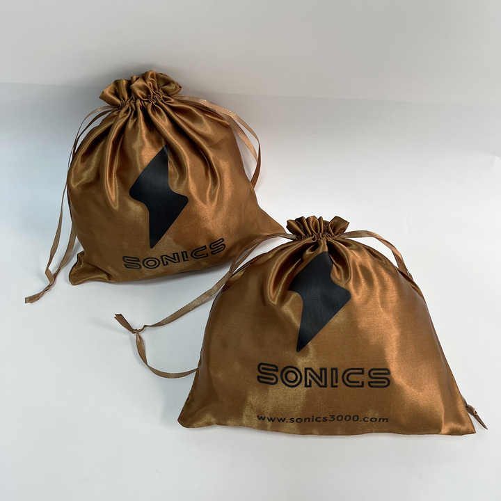 Custom Matte Gold Satin Drawstring Bags with Black Printing - Luxury Packaging for Electronics & Accessories