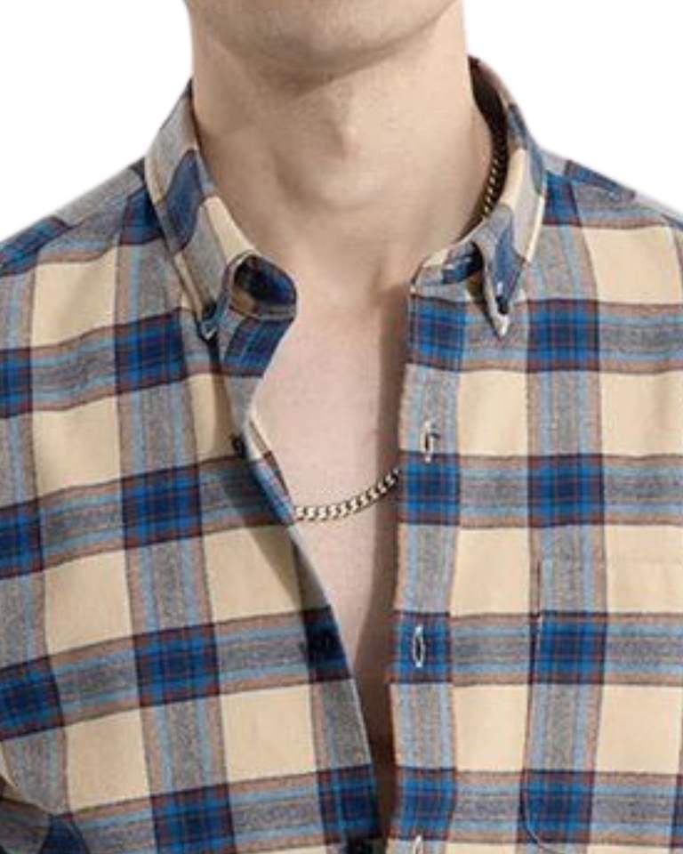 Custom Men Beige Blue Check Casual Shirt Cotton Polyester Long Sleeve Button Down Plaid Shirt For Wholesale OEM Supply Export
