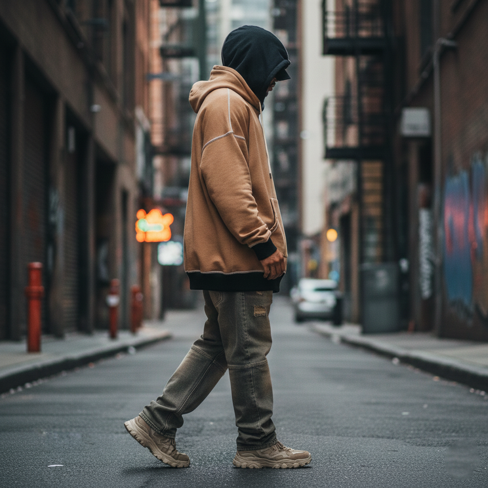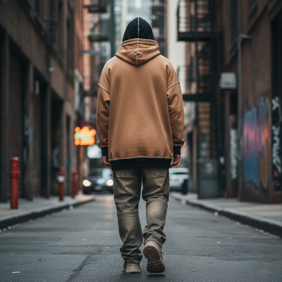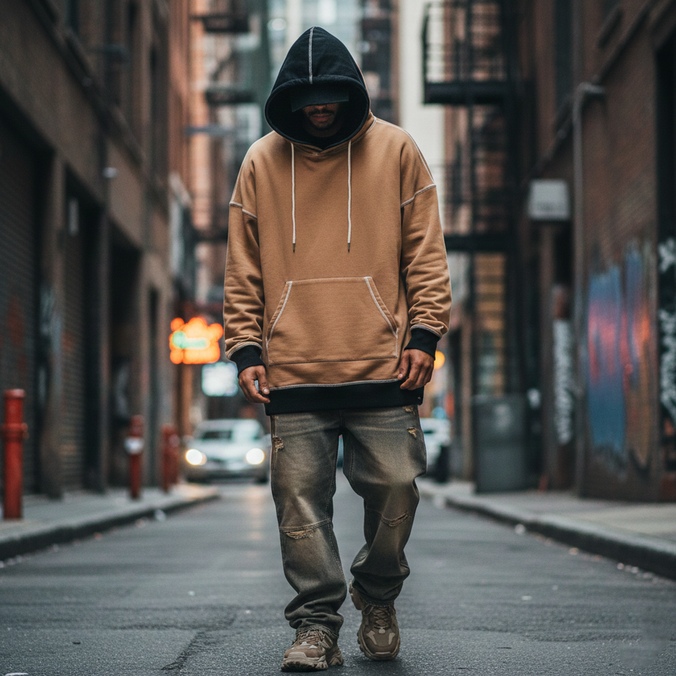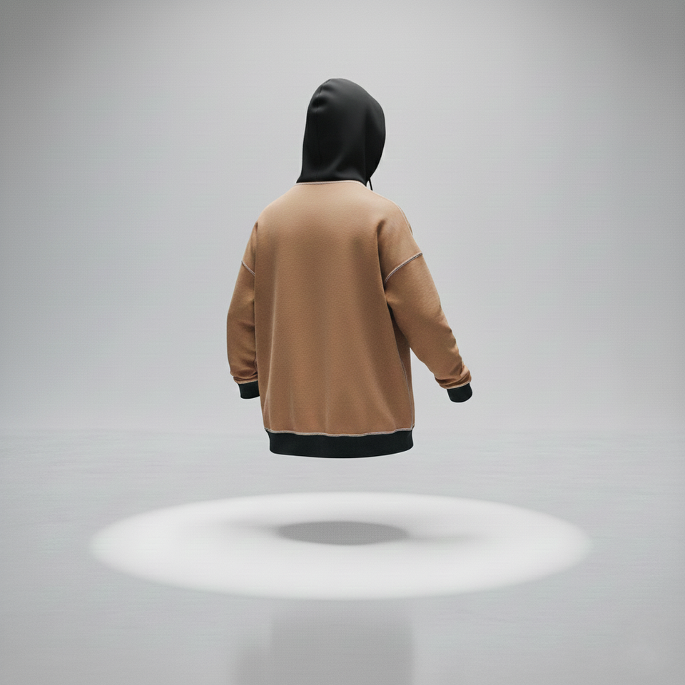 Custom Men Winter Streetwear Double Layered Heavyweight Tan Black Contrast Oversized Style Hooded Sweatshirt Digital Printing