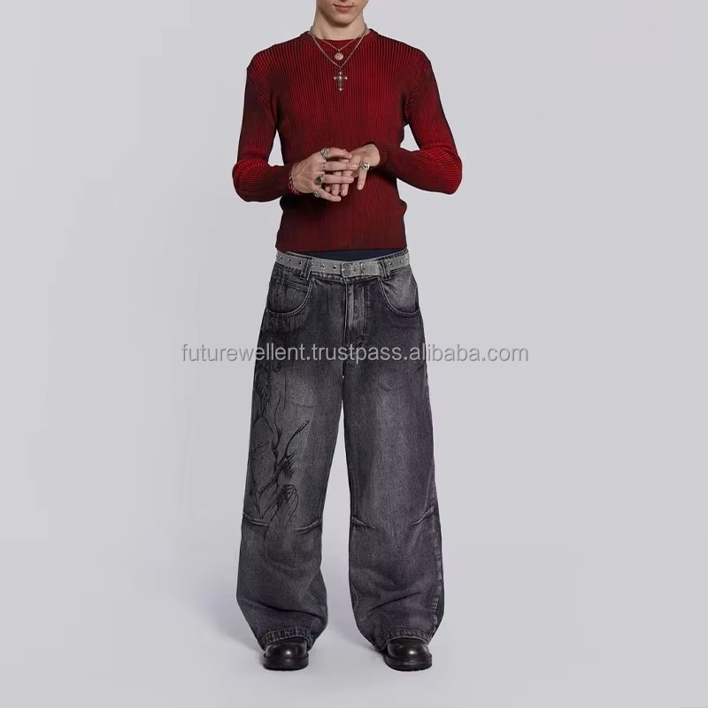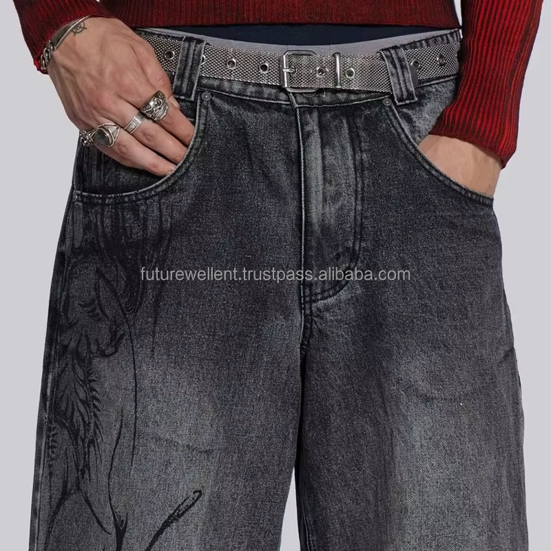 Custom Men's Baggy Streetwear Loose High Waist Oversize Wide Leg Black Denim Pants Washed Jeans For Hip Hop For Winter Spring