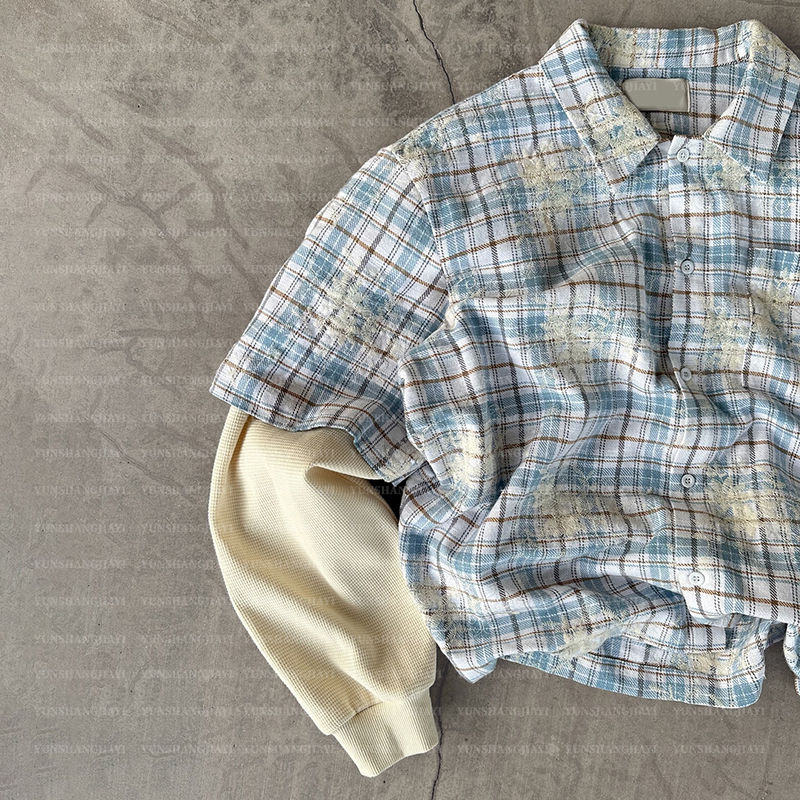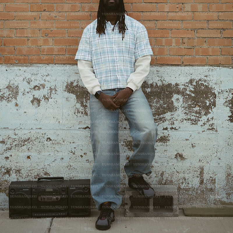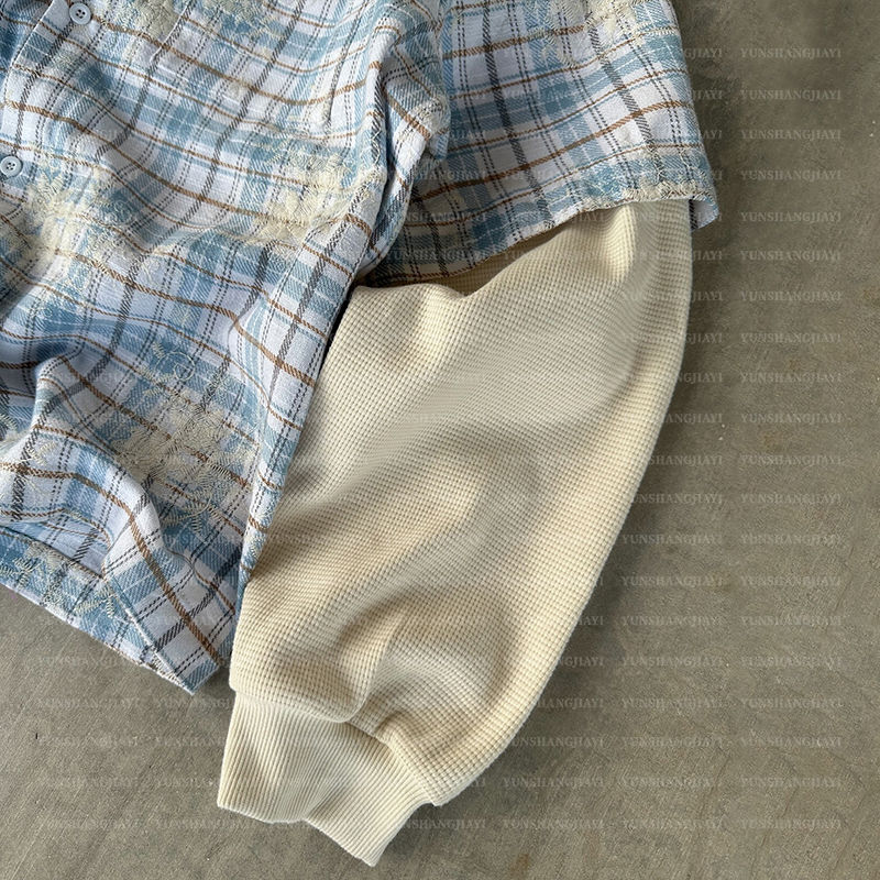 Custom Men's Casual Streetwear Waffle Double Layer Long Sleeve Plaid Vintage Flannel Shirt Baggy Oversized Anti-Wrinkle Print