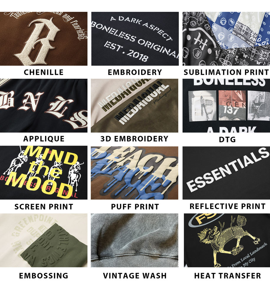 Logo position:Front, back, Left Sleeve, Right Sleeve, lower hem, back neck