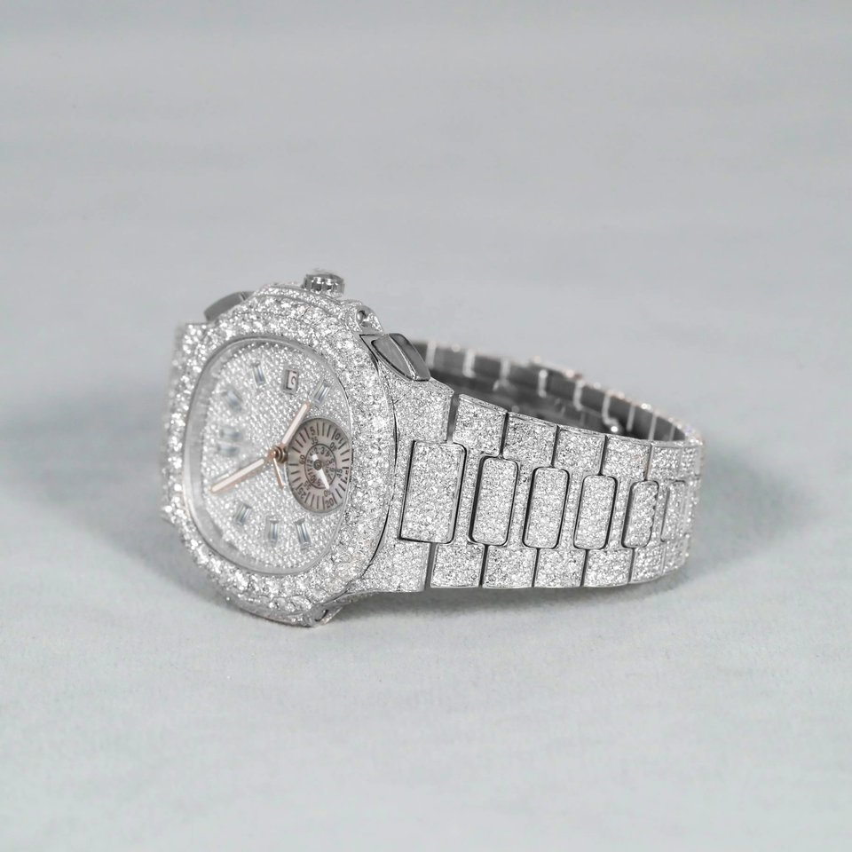 Custom Men's Luxury Iced Moissanite Diamond Hip Hop Wrist Watch VVS Clarity Square Case Stainless Steel Band Platinum Material