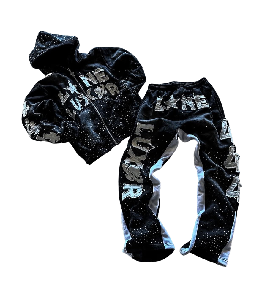 Custom Men's Plus Size Hoodie Pant Set Distressed Embroidery Patch Sun Faded Acid Wash Rhinestone Two-Piece Heavyweight Printed