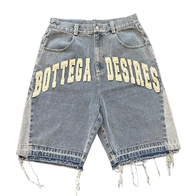 Custom Men's Raw VIRAL DENIM Baggy Jorts Distressed Hem Embroidered Jeans Shorts Rhinestone Applique Streetwear Vintage Summer