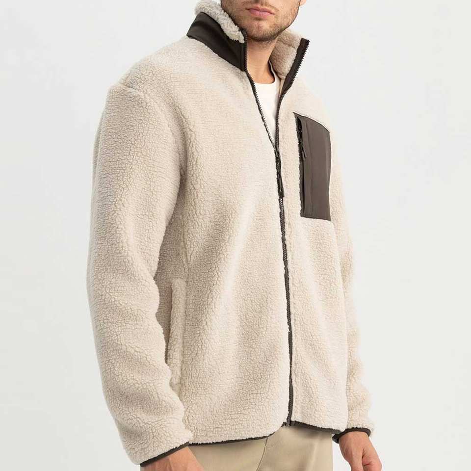 Custom Men's Winter Stand Collar Polar Fleece Hoodie with Digital Printing Beaded Embroidery Zip-Up Wool Sherpa Jacket