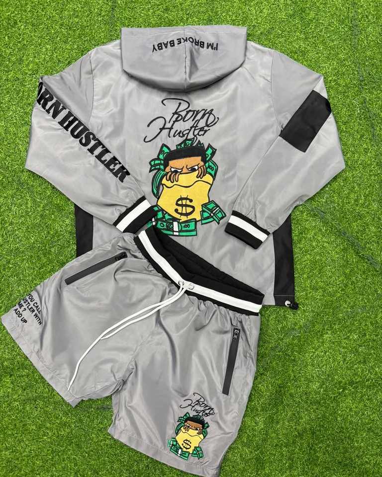 Custom Men's Summer Outfits Streetwear Nylon Windbreaker Jacket Hoodie and Shorts Flame Embroidery Logo Tracksuit Two-Piece Set