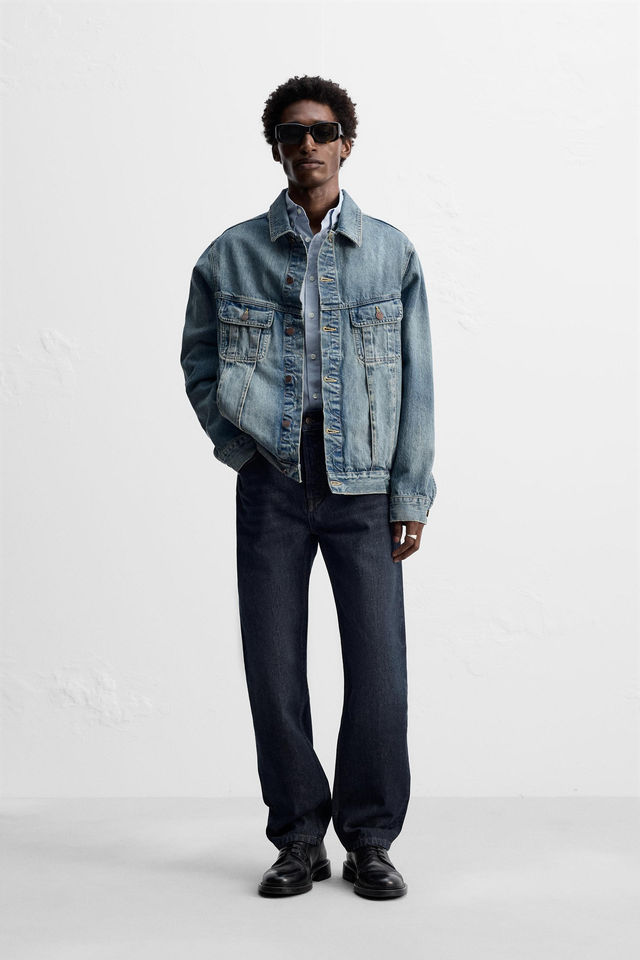 Custom Men’s Vintage Distressed Denim Jacket – Stone Wash Blue/Black, Breathable Polyester/Cotton, Button Detail Design