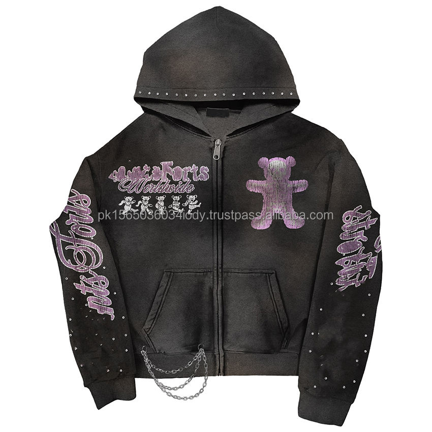 Custom Men's Vintage Washed Distressed Zip-up Hoodie for Men Custom Logo Acid Wash Oversized Hoodie