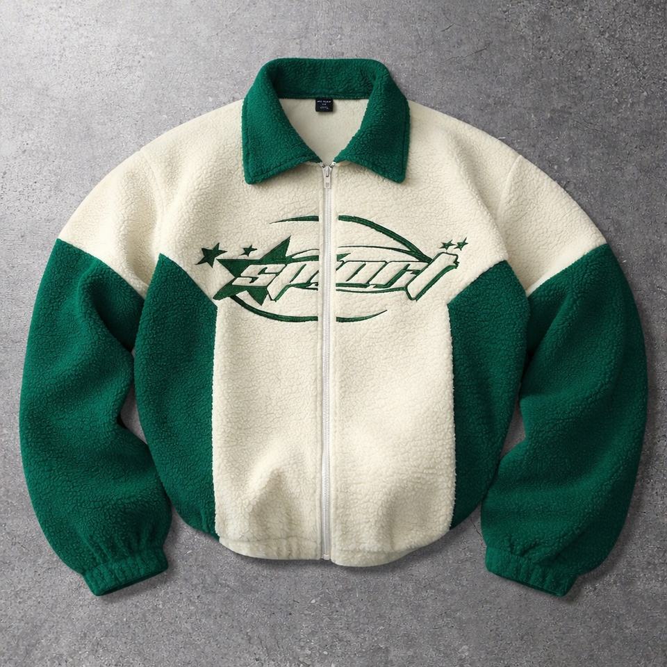Custom Men's Winter Sherpa Zip Fleece Jacket Long Sleeve Turn Down Collar And Patchwork Design Dyed Outdoor Zipper Sherpa Jacket