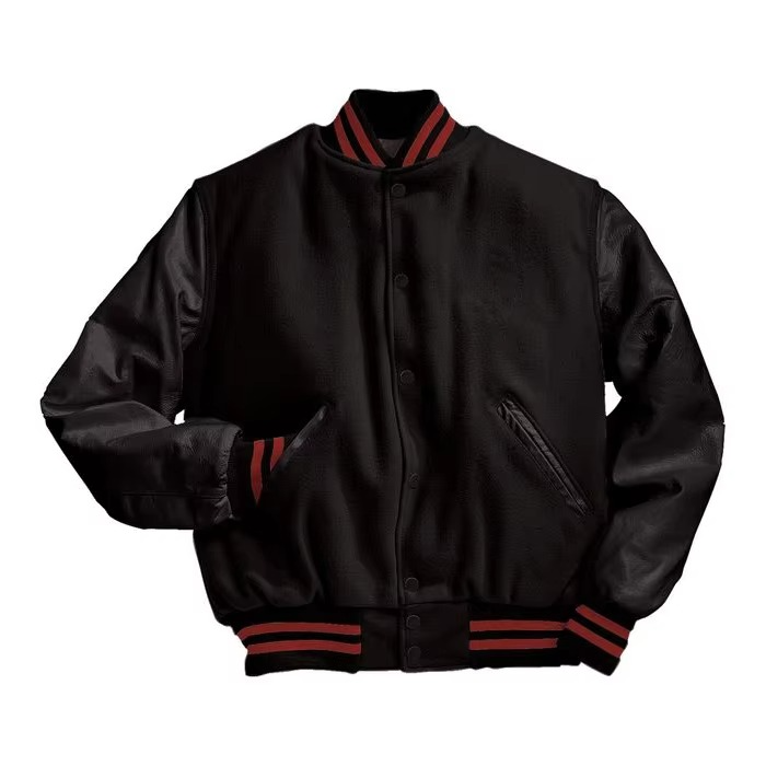 Custom Men's Wool Letterman Real Leather Varsity Jacket Black with White Color Embroidery Logos Patches and Labels Jacket