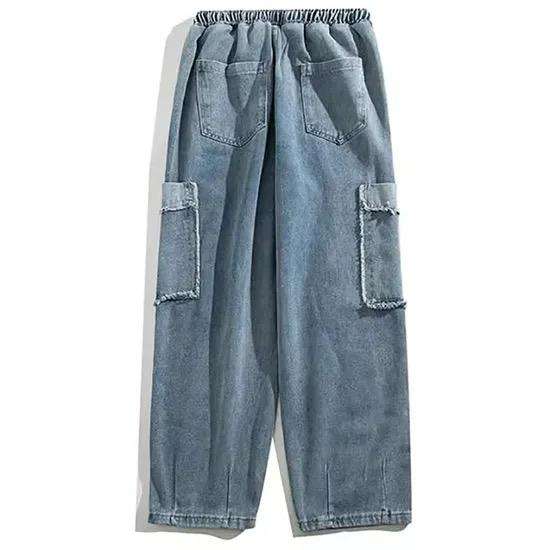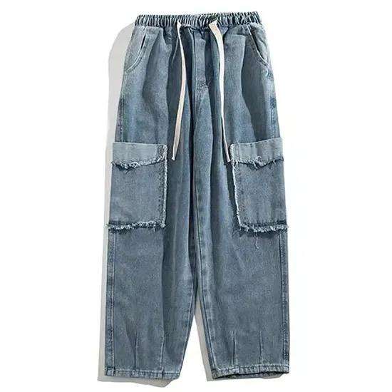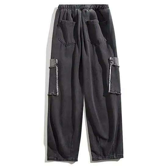 Custom Men's Y2K Loose Raw Edge Enzyme Washed 100% Cotton Mid Waist Jeans Medium Black for Spring Breathable Denim Button for