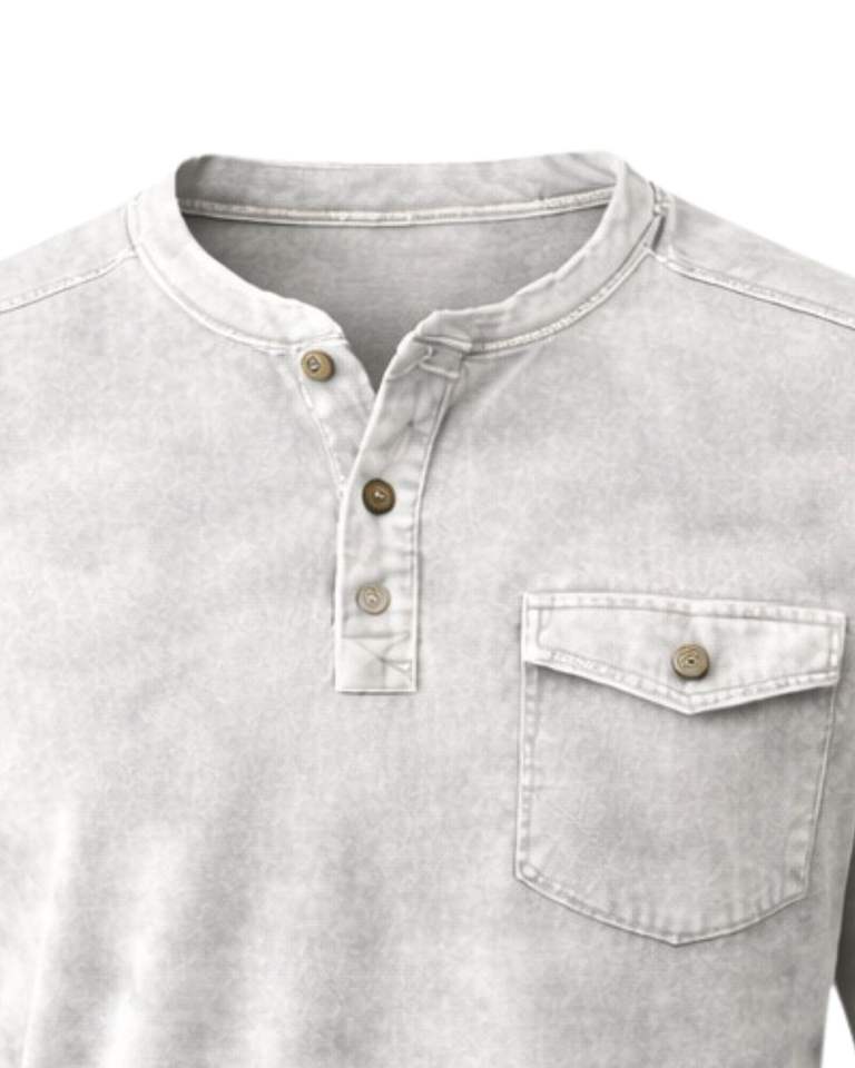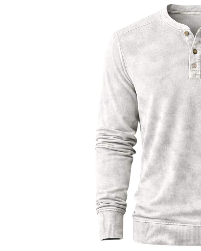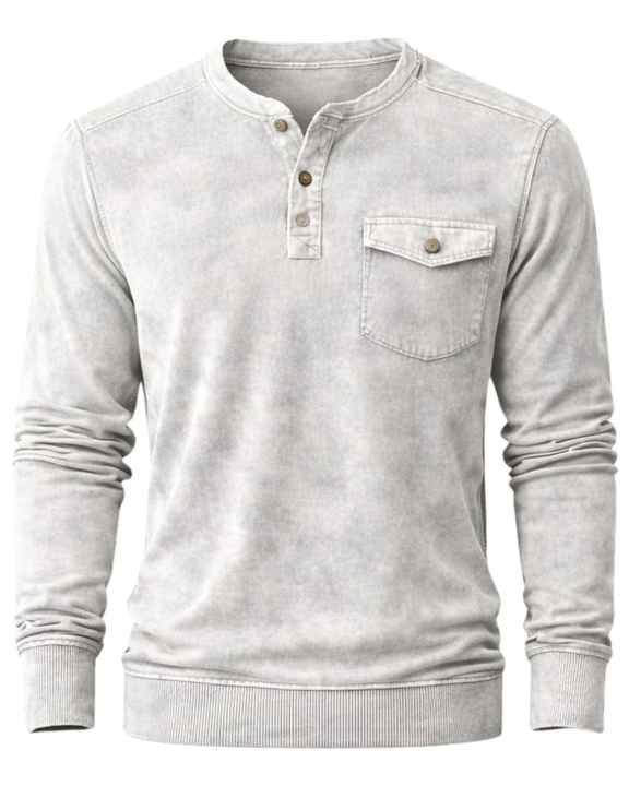 Custom Mens Acid Wash Henley Long Sleeve Sweatshirt Light Grey Casual Button Neck Pocket Style Winter Wear Cotton Slim Fit Top