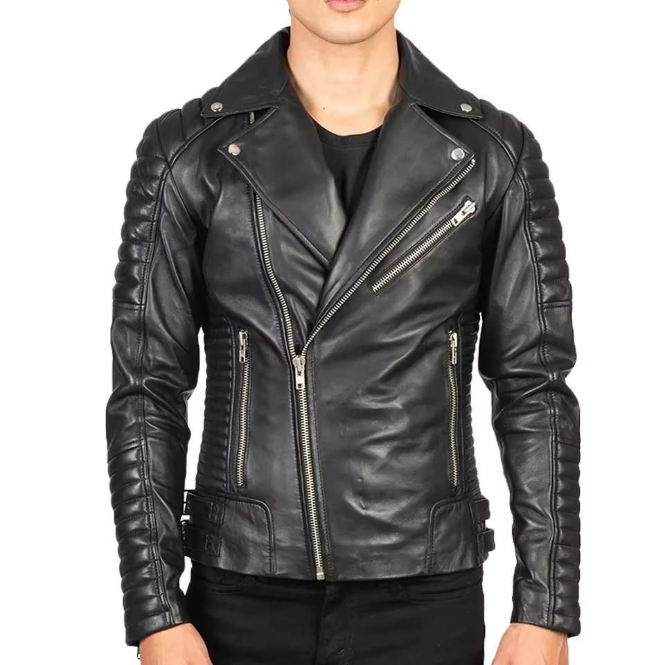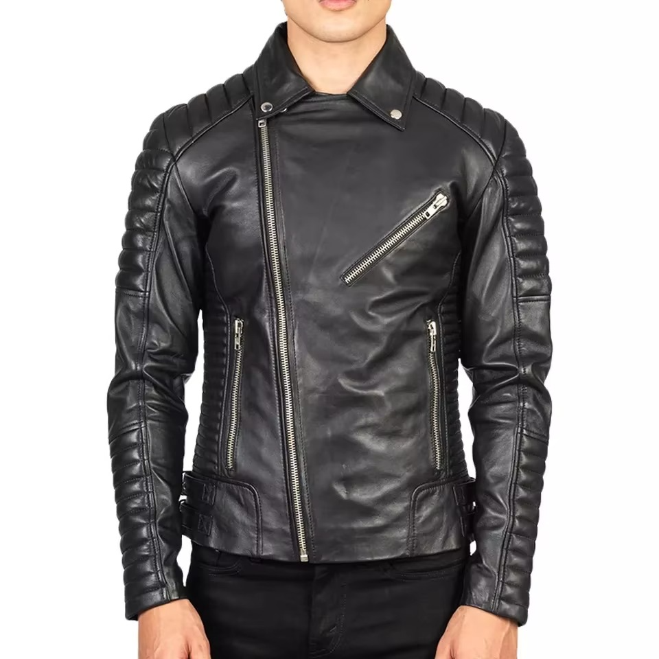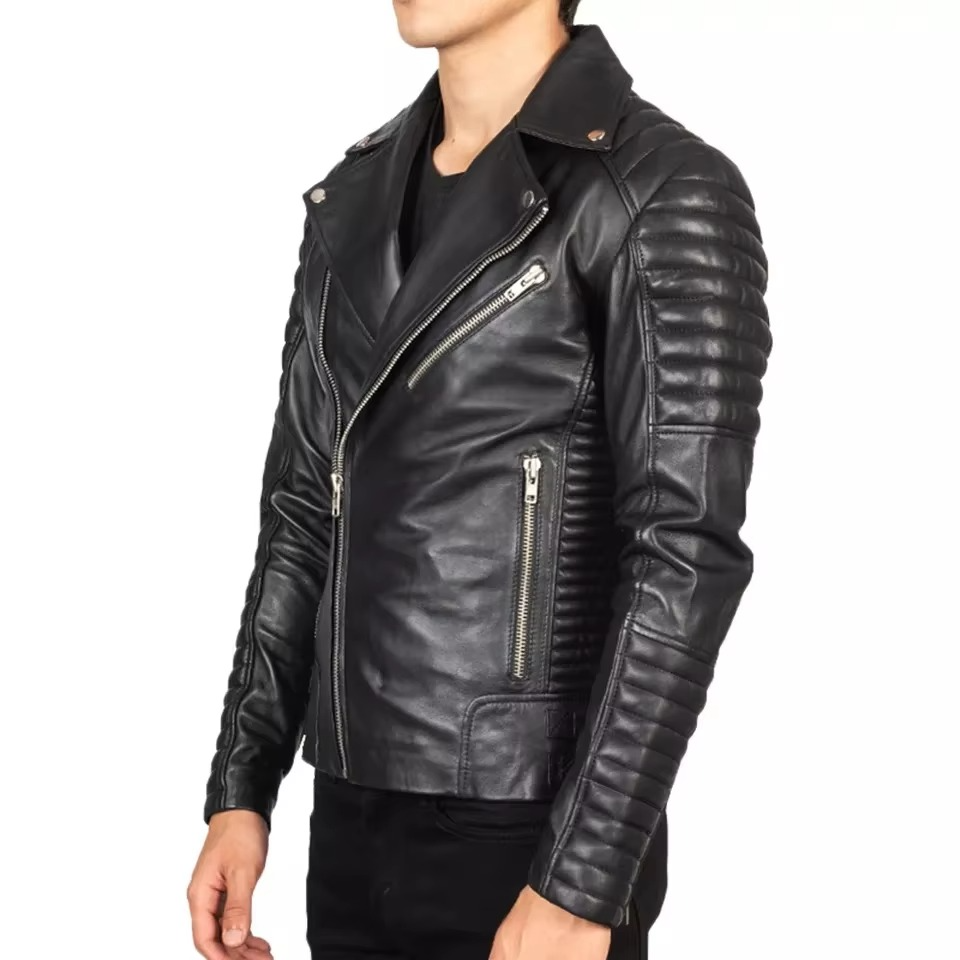 Custom Mens Ribbed Biker Leather Jacket Slim Fit Asymmetrical Zip Genuine Lambskin Motorcycle Jacket OEM