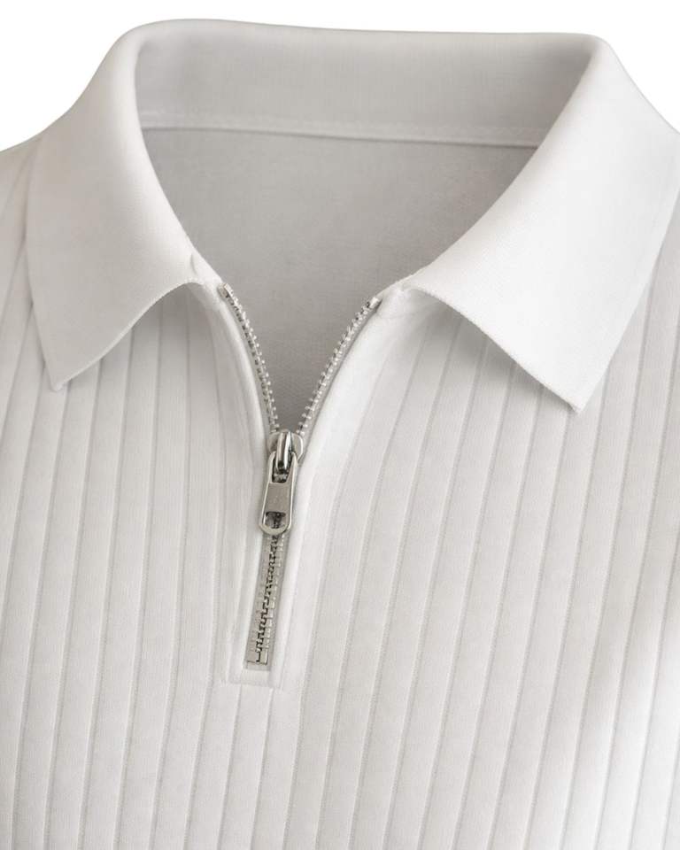 Custom Mens White Ribbed Quarter Zip Polo Shirt Short Sleeve Knit Fabric Contrast Collar Custom Manufacturer Casual Summer Wear