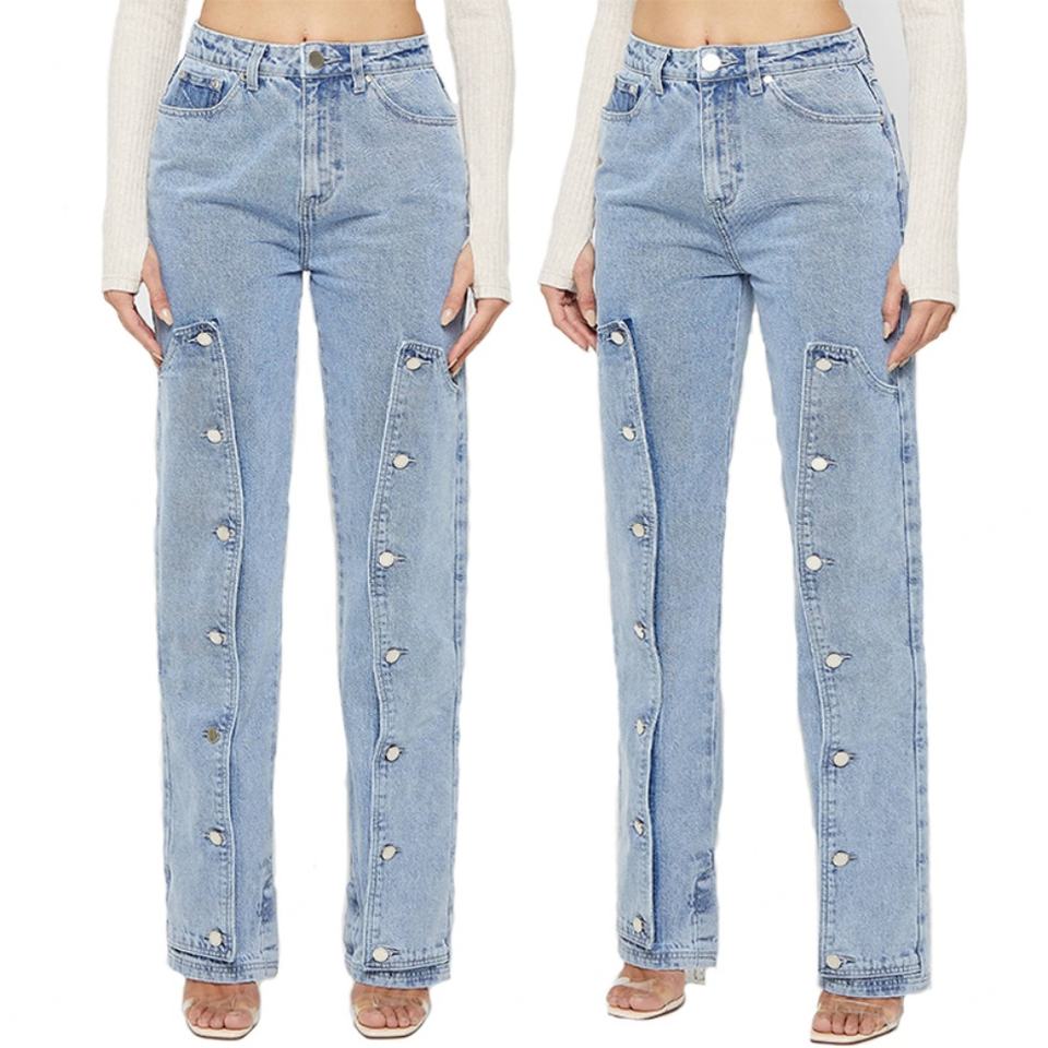 Custom Mid Blue Straight Leg Jean Trousers for Women Button Down Mom Denim Jeans Pants