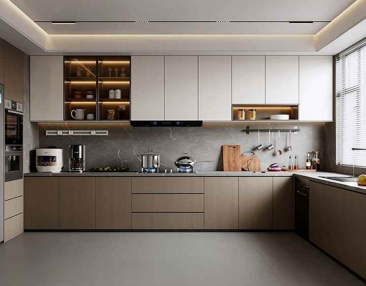 Custom Modern Complete Kitchen Furniture Set with Glass and Faucet Contemporary Melamine Board Cabinets Drawer Baskets Sinks