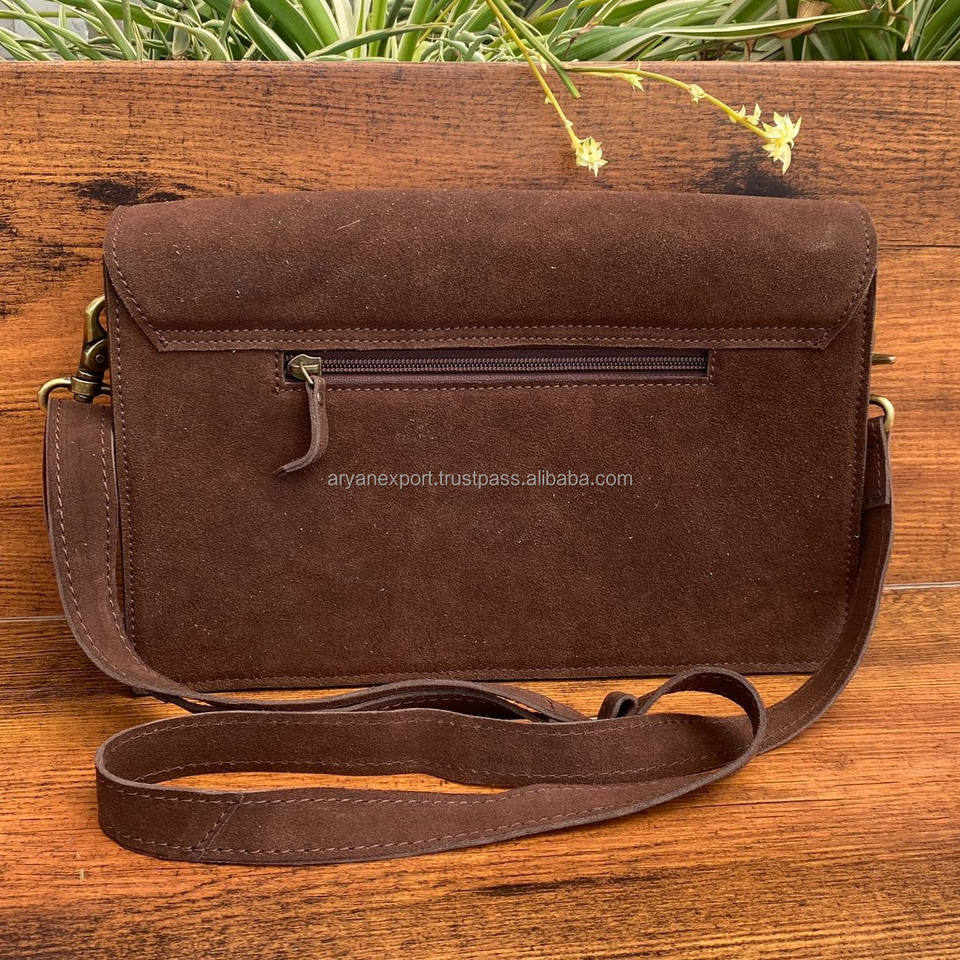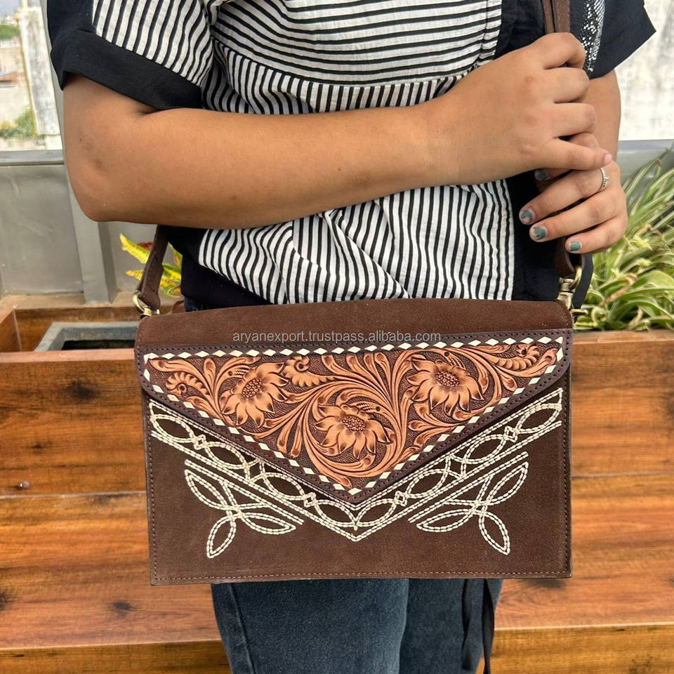 Custom Modern Design Hand Tooled Boot Stitch Genuine Suede Leather Crossbody Flap Bags for Women Cowhide Floral Portable Handbag
