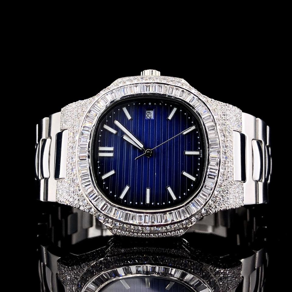 Custom Moissanite Diamond Wrist Watch For Unisex With Numeric Blue Dial Luxury Custom Hand Mad Design Watch Only Bezel Watch