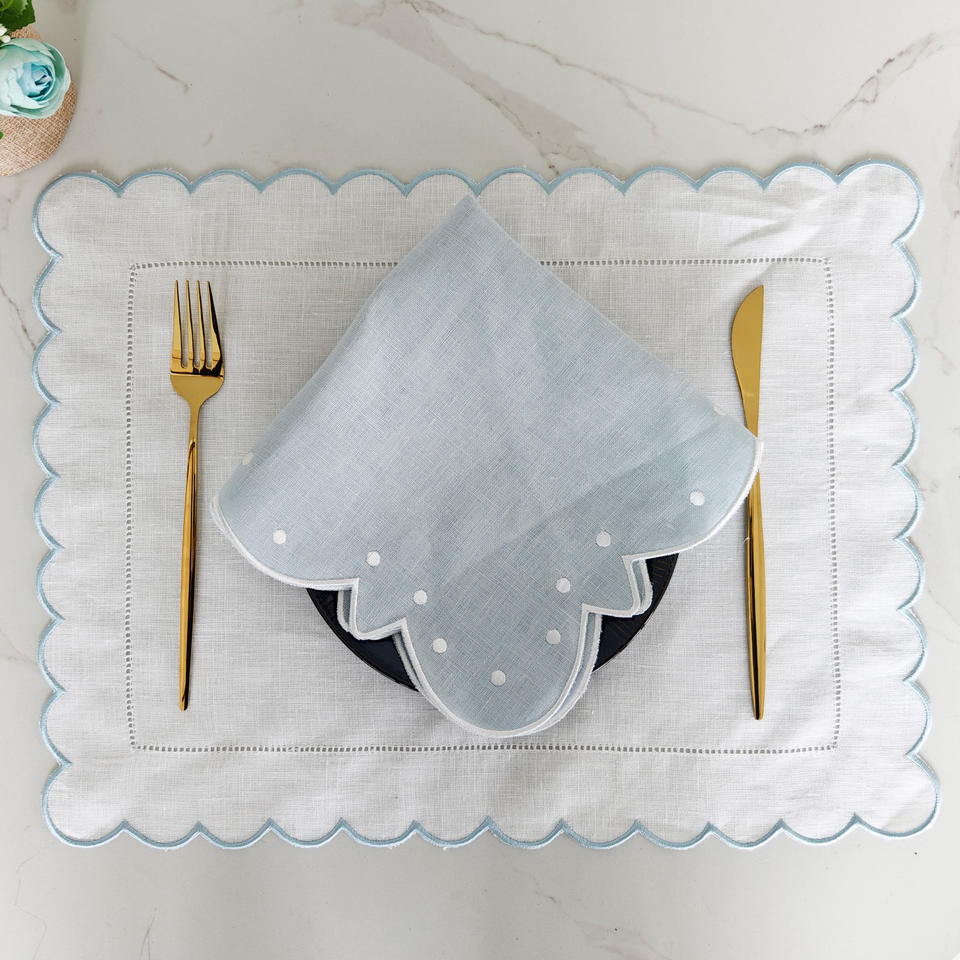 Custom Monogram Wholesale 100% Linen Classic Design Scallop Embroidered Hemstitch Cloth Napkins for Hotel/Party/Wedding