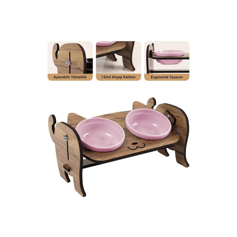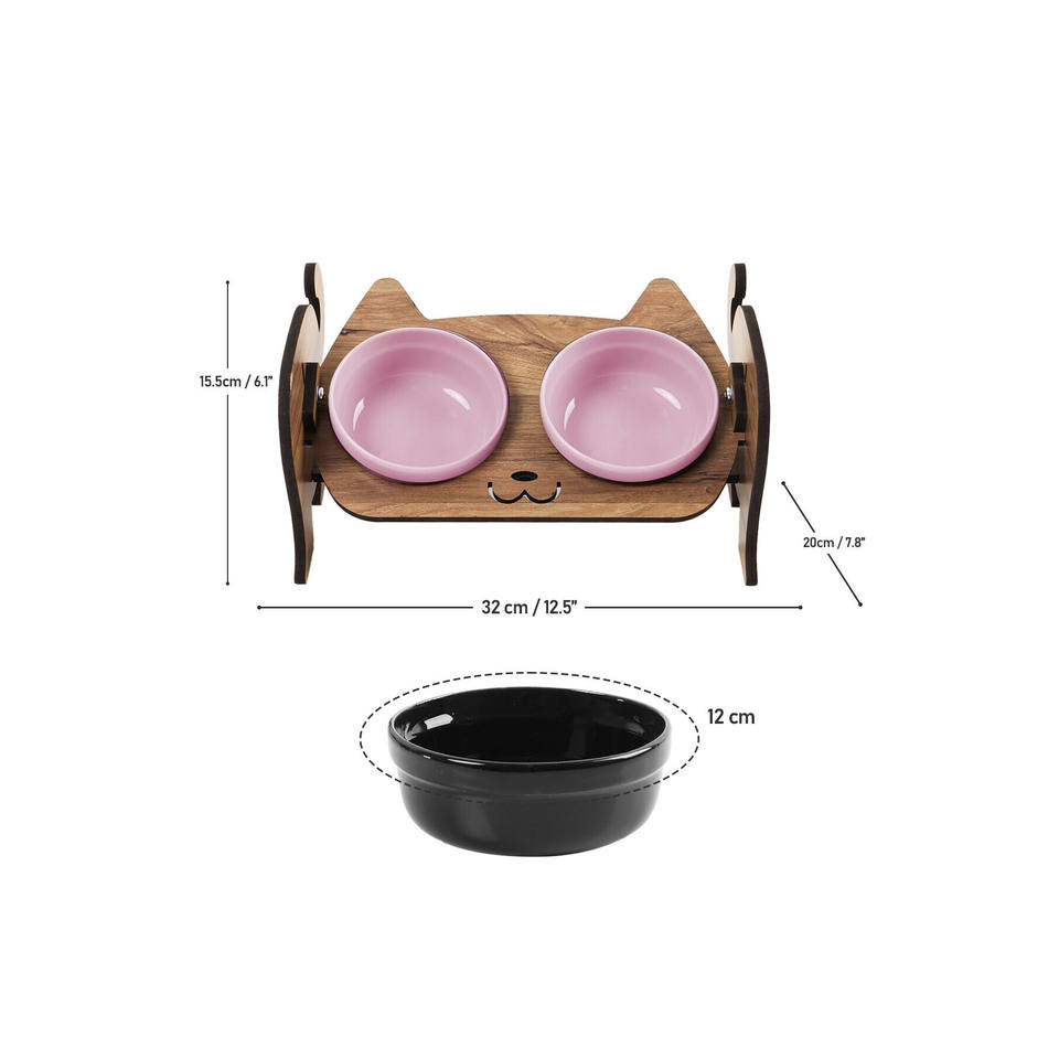 Custom Name Printed Horns Wooden Cat Food and Ceramic Water Bowl Stand with Gift Cat Mat One Size