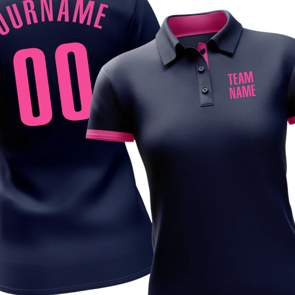 Custom Navy Blue Sublimation Polo Shirt with Pink Accents Personalized Team Name and Player Number Stylish Comfortable Wears