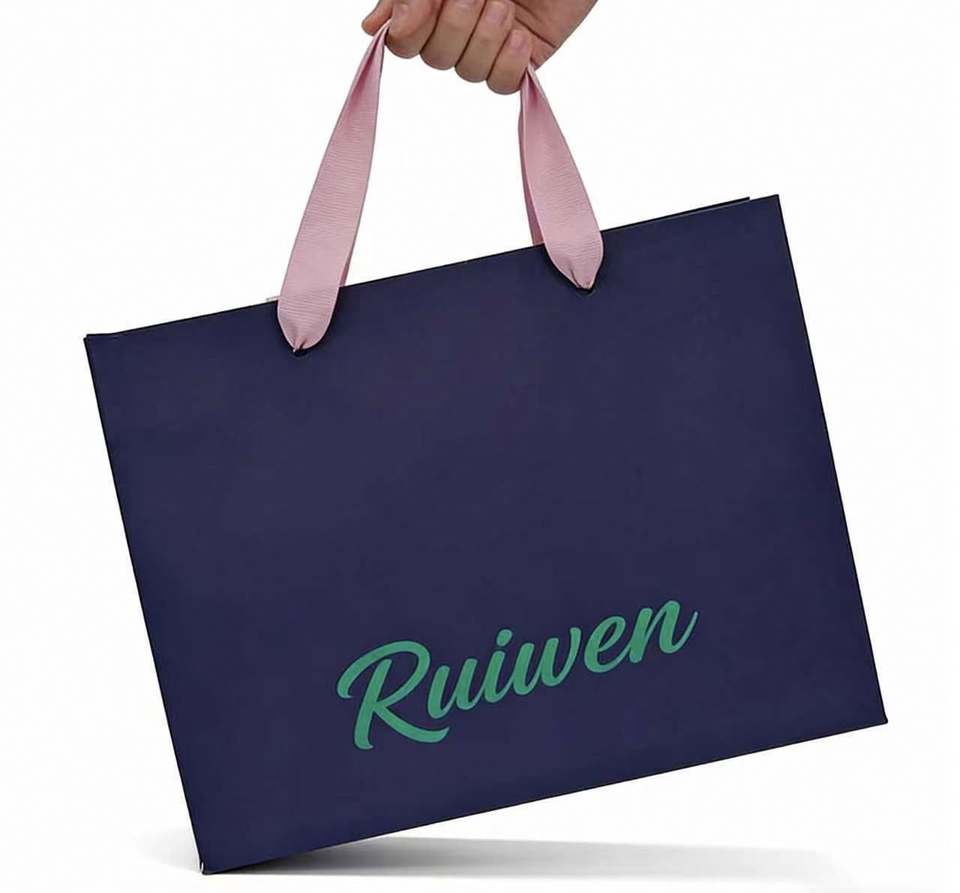 Custom OEM Free Design Handmade Pink Ribbon Handle Coated Dark Blue Kraft Packaging Paper Bag for Gift Packaging