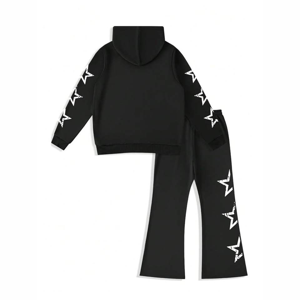Custom OEM Toddler Children Kids Black Flared Sweatsuit Clothes 2 Piece Sets Tracksuit Hoodies and Stacked Pant Baby Clothes Set