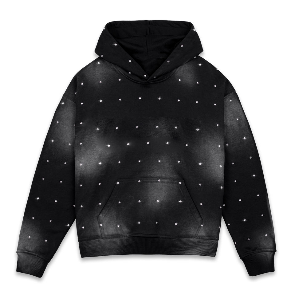 Custom Oversized High Quality Sun Fade Streetwear Hoodie with Rhinestone Pullover 100% Cotton Fleece Black Hoodie for Men