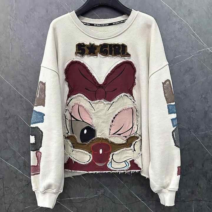 Custom Oversized Winter Sweatshirt for Women Cartoon Embroidery Thick Fleece-Lined Long Sleeve Top